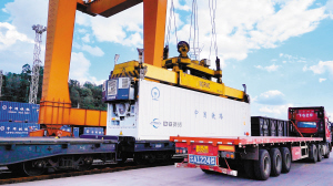 ▲▲11月20日,首批满载泰国榴莲的货运列车到达昆明安宁,货车对集装箱进行转运。 安宁市融媒体中心供图