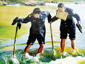 在昆明市公安局禄劝县公安局办公室里有这样一张照片,照片里两名民警手里提着鞋子、光着脚,正蹚过湍急的河水,其中一人的嘴里咬着卷宗……
