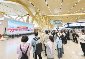 旅客在昆明长水国际机场收看纪念中国人民抗日战争暨世界反法西斯战争胜利80周年大会直播。记者王绍芬摄
