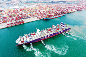 在山东港口青岛港,一艘货轮在拖船辅助下停靠集装箱码头。新华社